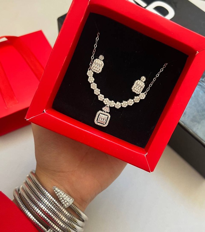 این محصول وارداتی از کشور ترکیه بوده وتمامی جزئیات دقیقا مشابه نمونه طلای آن و دارای نمای چند بعدی میباشد. اقلام سرویس شامل گوشواره و گردنبند آب نقره-رنگ ثابت ضدحساسیت نگین ها ریزش ندارن