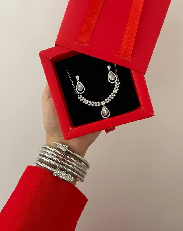این محصول وارداتی از کشور ترکیه بوده و تمامی جزئیات دقیقا مشابه نمونه طلای آن و دارای نمای چند بعدی میباشد. اقلام سرویس شامل گوشواره و گردنبند آب نقره-رنگ ثابت ضدحساسیت نگین ها ریزش ندارن