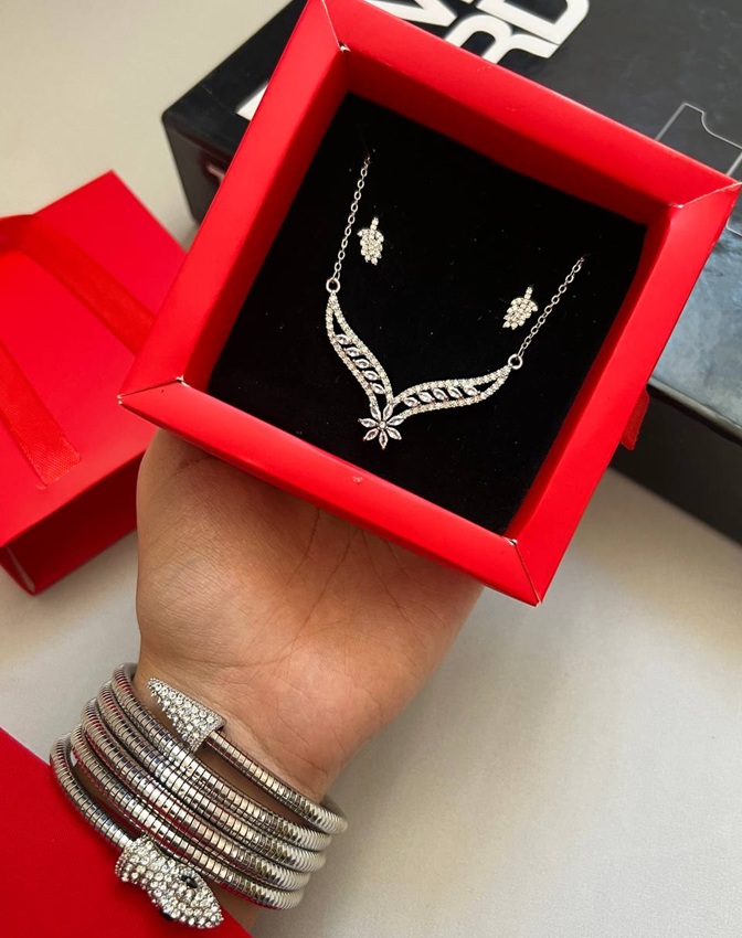 این محصول وارداتی از کشور ترکیه بوده وتمامی جزئیات دقیقا مشابه نمونه طلای آن و دارای نمای چند بعدی میباشد. اقلام سرویس شامل گوشواره و گردنبندآب نقره-رنگ ثابتضدحساسیتنگین ها ریزش ندارن