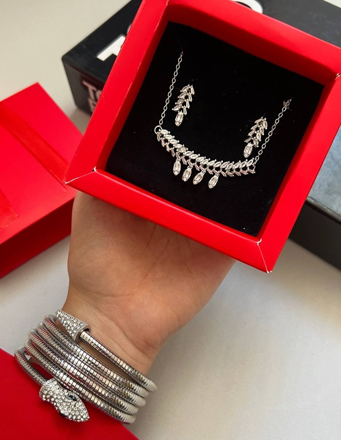 این محصول وارداتی از کشور ترکیه بوده وتمامی جزئیات دقیقا مشابه نمونه طلای آن و دارای نمای چند بعدی میباشد. اقلام سرویس شامل گوشواره و گردنبندآب نقره-رنگ ثابت ضدحساسیت نگین ها ریزش ندارن